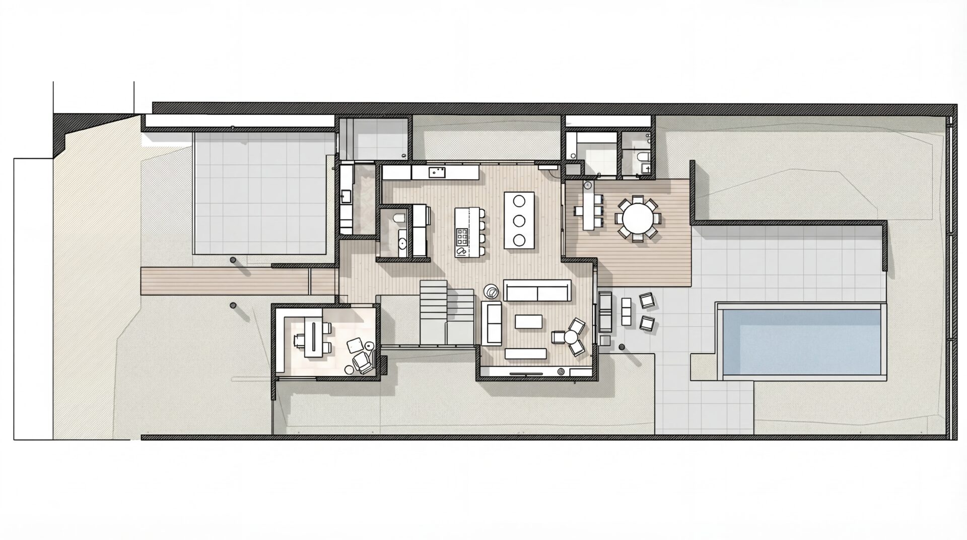 E te diz o arquiteto, por outro lado: quem deixa um apartamento metropolitano, quer a amplitude do horizonte. Espaços largos. Sentir a brisa cruzar o vazio — e um raio de sol que o preenche. Quer brincar com água — e com o fogo.